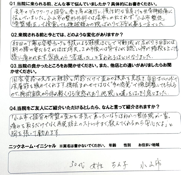 改善しなかった「腰痛」が、ほねかつ整体で悩まなくなりました! ちえ子様 50代 女性 小山市